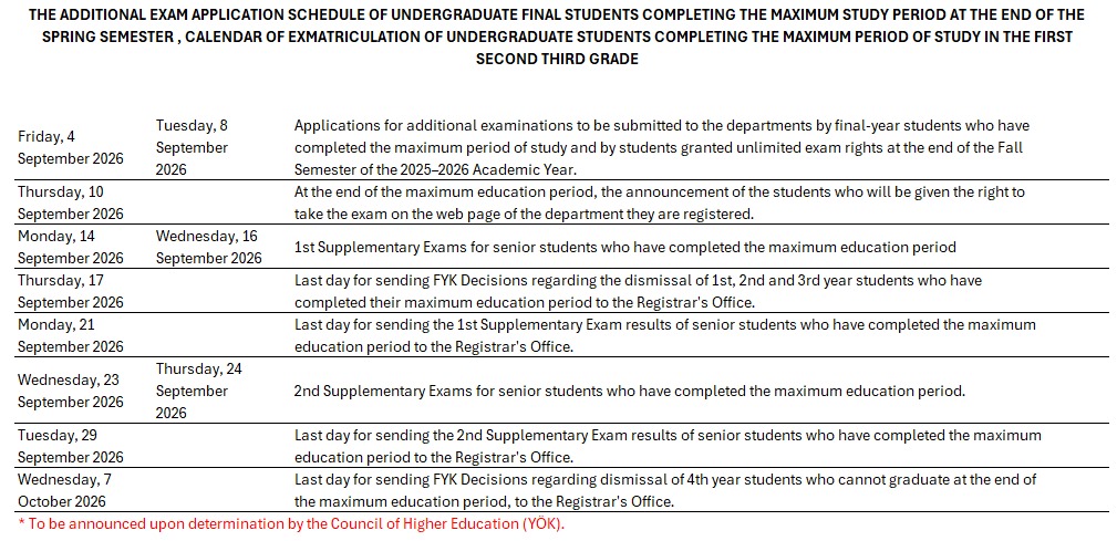 The Additional Exam Application Schedule of Undergraduate Final Students Completing the Maximum Study Period at the End of the Spring Semester , Calendar of Exmatriculation of Undergraduate Students Completing the Maximum Period of Study In the First Second Third Grade