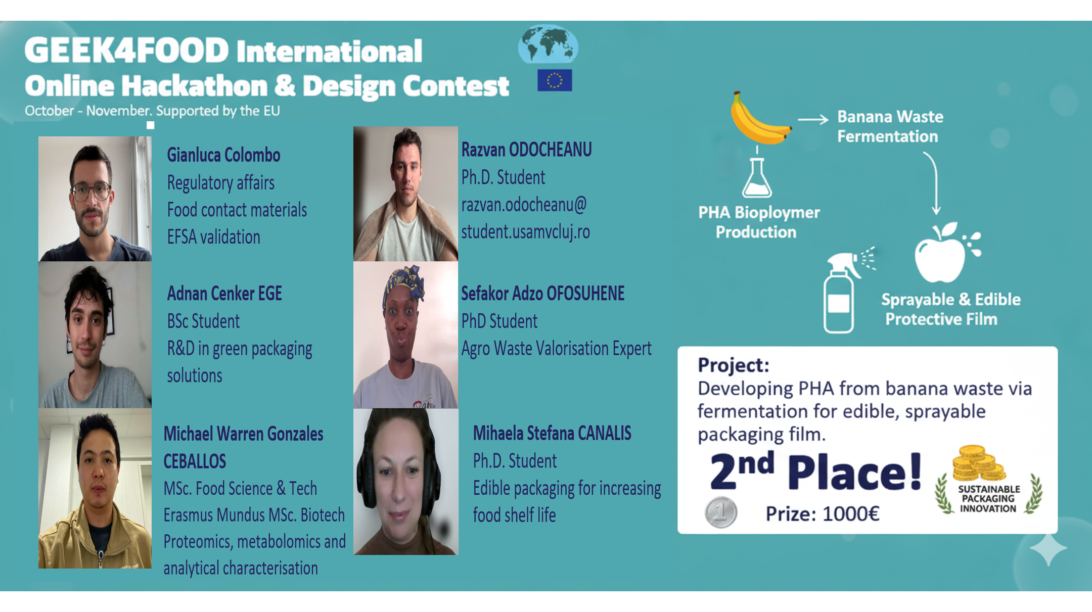 Our undergraduate student, Adnan Cenker Ege, together with his team “LOOPACK,” won second place in the eco-design category of the GEEK4FOOD hackathon and design competition, which is supported by the European Union. Their project focused on producing PHA through the fermentation of banana waste using specific microbial strains and converting this biopolymer into a sprayable and edible film form.